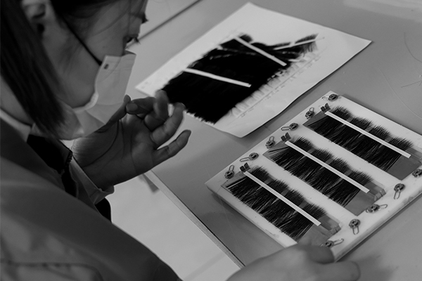 Slightly different from regular knitting, hairs are placed onto a mold. This shapes the hairs as shown. Finally, glue them together for the next process.